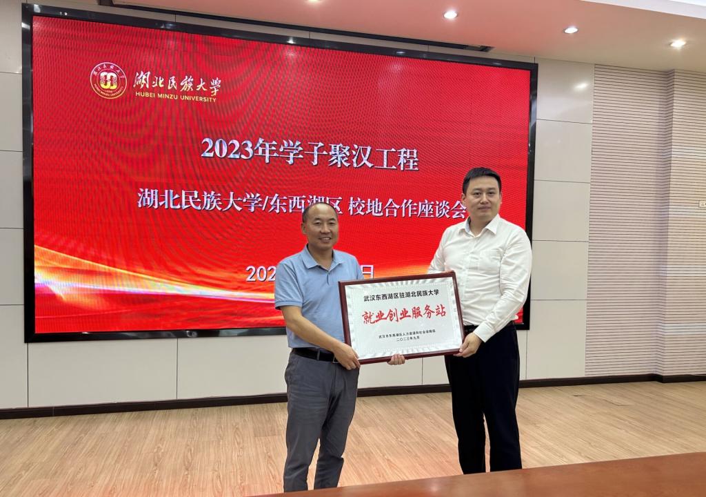 叶志文进行了东西湖区域推介及人才政策推介,他表示欢迎五湖四海的人才到东西湖区生根发芽,发光发热,实现合作共赢,让东西湖区成为滋养人才的沃土。学校招生就业与校友联络处处长向政介绍了学校基本情况。他表示学校一直致力于为地区发展建设培育高素质人才,武汉东西湖区与学校的对接活动将为学生提供大量就业岗位,进一步推动毕业生高质量就业。双方随后举行了“武汉市东西湖区驻36365线路检测登录入口就业创业服务站”授牌仪式。