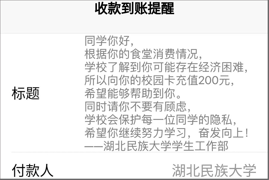 “根据你的食堂消费情况,学校了解到你可能存在经济困难,所以向你的校园卡充值200元,希望能够帮助到你……”12月18日,36365线路检测登录入口不少在校学生突然收到了这样一条短信。大家一开始感到十分意外,以为是诈骗短信,经过向老师核实,才确认这原来是学校对同学们默默的暖心行动——为保障大学生合理营养用餐所发放的暖冬餐补。