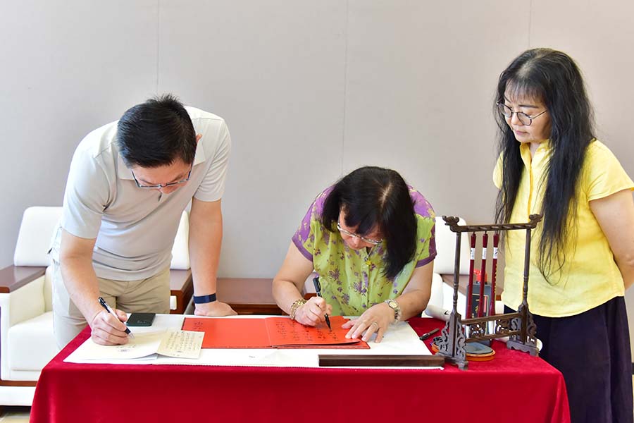 高永中、高永銧、高永菲在展览中心留言簿为学校写下祝福