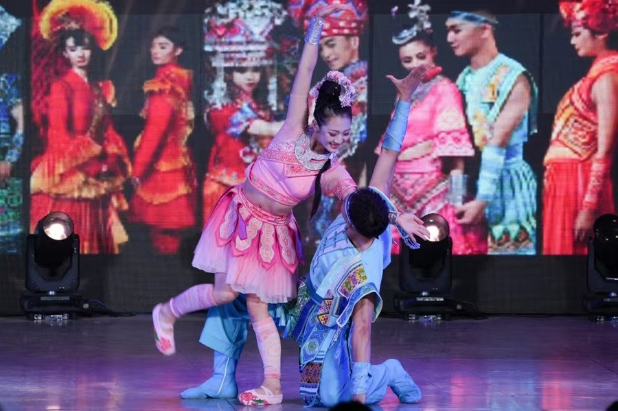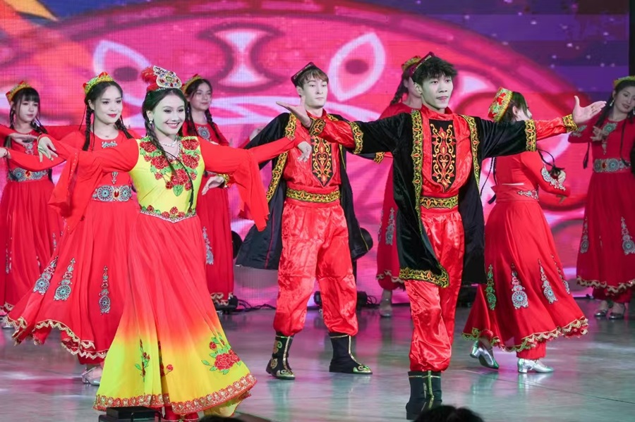 晚会在歌舞《我们的新时代》中拉开帷幕,节目展示了民大学子青春亮丽的底色,用热情有力的舞姿展现出民大学子青春风貌。舞蹈《石榴花开》以曼妙激昂的优美赞颂美好新时代,用声声铃鼓展现民族团结的力量。歌曲串烧《一见倾“新”》则通过轻快欢乐的旋律和青春洋溢的歌词表达了民大学子砥砺奋进的蓬勃朝气。