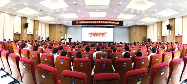 本网讯 为庆祝2020年中国医师节,全面总结医院抗疫阶段性工作,8月18日下午,36365官网附属民大医院举行2020年医师节暨抗疫总结表彰大会。学校党委常委、副校长邓磊出席,医院领导以及临床医技科室、行政职能部门主任,党支部书记、援汉医疗队、下县包片专家、临床医技科室医师代表及获表彰人员参会。医院党委副书记邹莉主持会议。