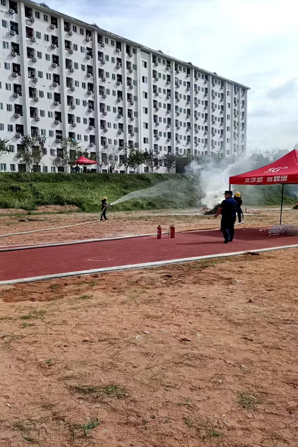 保卫工作部部长周代明宣布消防安全培训柴堆灭火演练开始。消防教官首先讲解干粉灭火器的使用方法、初期火灾扑救方法及柴堆灭火注意事项。接着,向学生示范如何用干粉灭火器和消防水带扑灭柴火堆。现场学生20人一组在教官的指导下开始灭火器柴堆灭火实操演练,同学们踊跃参与,积极展示学习成果。