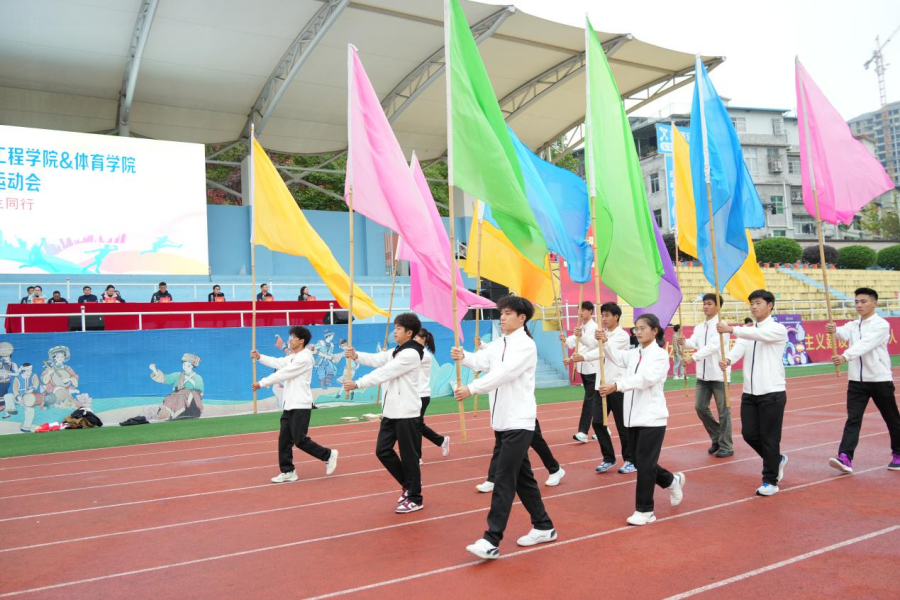 开幕式上,彩旗飘扬,气氛热烈。彩旗队、裁判队、教职工方阵、研究生方阵与各本科生方阵共44个方阵依次入场,各代表方阵迈着整齐有力的步伐依次入场,他们精神抖擞、口号嘹亮,充分展示了两院学子的青春风采与昂扬斗志。