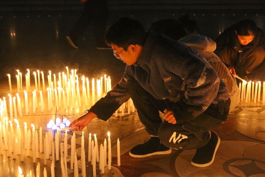国旗护卫队在大学生广场举办“烛光祭”活动,以烛光寄哀思,为南京大屠杀遇难同胞祈福。学生领取蜡烛并点燃烛光后写下缅怀或祝福的便签,随后进行一分钟默哀仪式。同时,现场蜡烛摆放成手掌和“1937.12.13”的字样,青年学生手捧白蜡,为30余万遇难同胞点亮烛光,告慰逝者。烛光摇曳,照亮了黑夜,也映照出学生心中那份对和平的祈愿,并时刻提醒着学生永远不要忘却那段伤痛的历史。