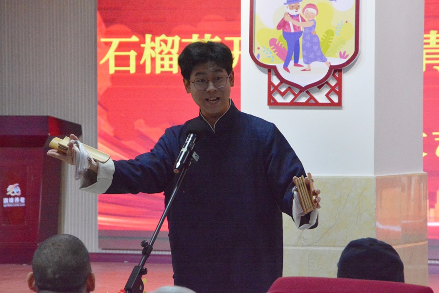 文艺表演正式开始,学生们用歌声和舞蹈展示着各自民族的独特魅力。摆手舞开场,奠定欢快基调;少数民族舞蹈串烧、冬不拉演奏《民曲串烧》、快板《同仁堂》等节目,依次展现各民族文化内涵与艺术魅力;土家族《嗬嗬吔》、舞蹈《莲湘欢歌》感染力十足,让老人们沉浸其中。最后,全体合唱《没有共产党就没有新中国》,升华了民族团结与爱国主义情感。