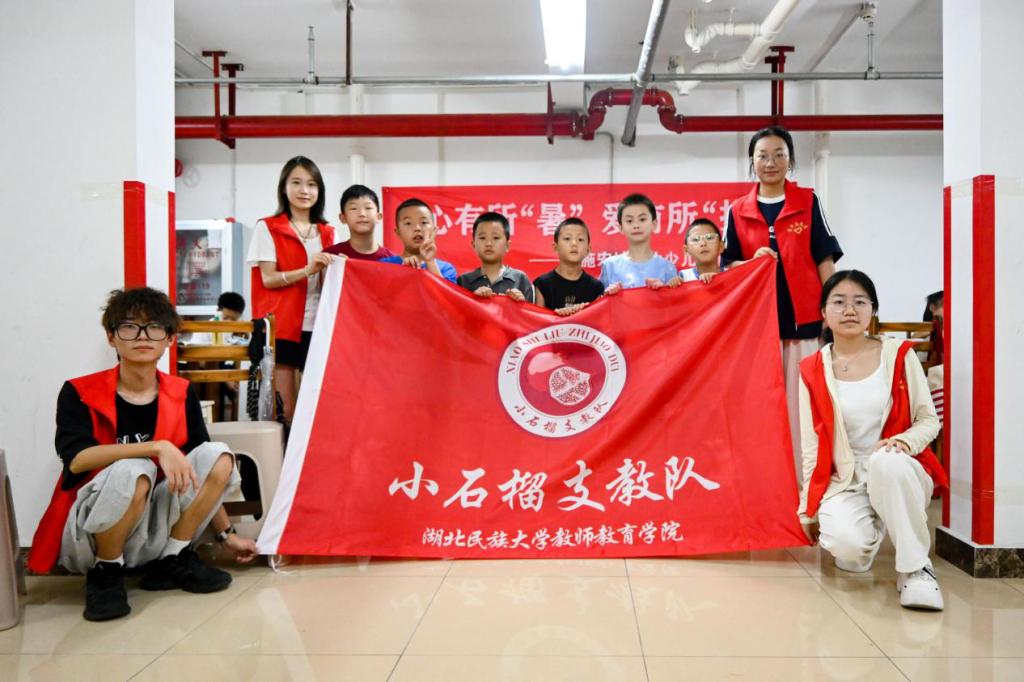 与此同时,“小石榴”支教队在恩施市金龙府郡社区和宏城物业少儿爱心托管班开展为期两周的暑期托管服务,为38名小学生提供了专业辅导与丰富多彩的特色课程。在作业辅导方面,这支由小学教育专业学生组成的团队充分发挥师范生优势,采用分组辅导、针对性解答等方式,为孩子们营造了高效专注的学习氛围。一位家长反馈:“老师们讲题特别清楚,孩子回来就把作业都做完了,还说效率比以前高了不少。”除了课业辅导,支教队还精心设计了艺术、科学、非遗等特色课程。在“童心共绘地球梦”绘画课上,孩子们用画笔描绘出长征火箭、嫦娥探测器等场景,表达对祖国航天事业的自豪;在“能量从哪里来”科学课上,队员们用生动有趣的讲解激发了孩子们探索科学的兴趣;在中国结编织课堂上,队员们耐心指导,让孩子们亲手制作出象征吉祥的传统手工艺品。