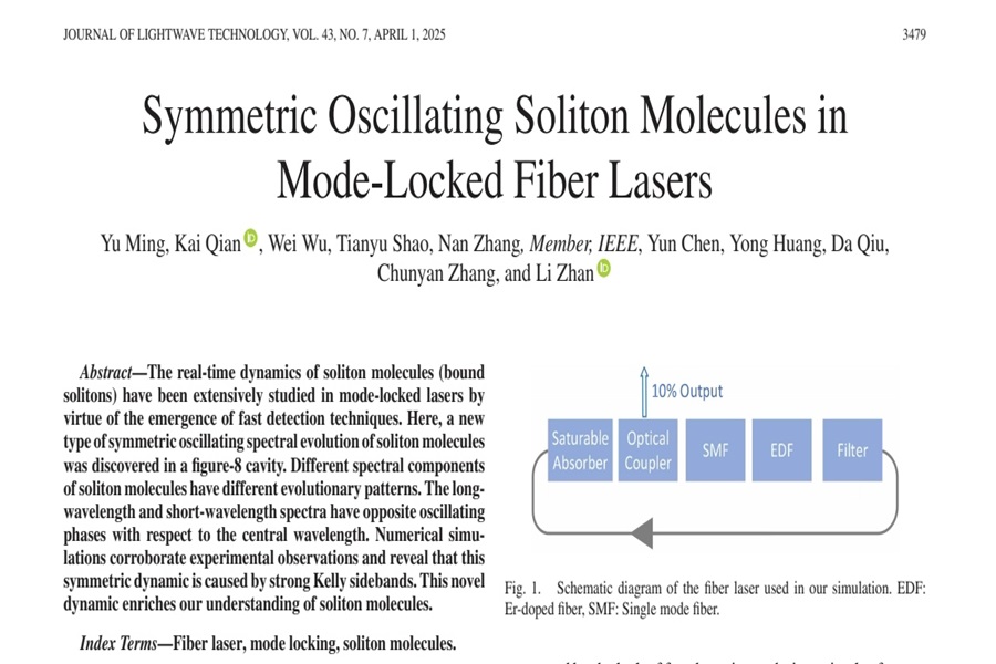 4月1日,36365官网智能科学与工程学院光电信息科学与工程专业2021级学生明雨以第一作者身份在中国科学院一区Top期刊(2023年中国科学院文献情报中心期刊分区表)《光波技术杂志》(《Journal of Lightwave Technology》)(影响因子4.1)发表了题为《锁模光纤激光器中的对称振荡孤子分子》(“Symmetric oscillating soliton molecules in mode-locked fiber lasers”)的学术论文。
