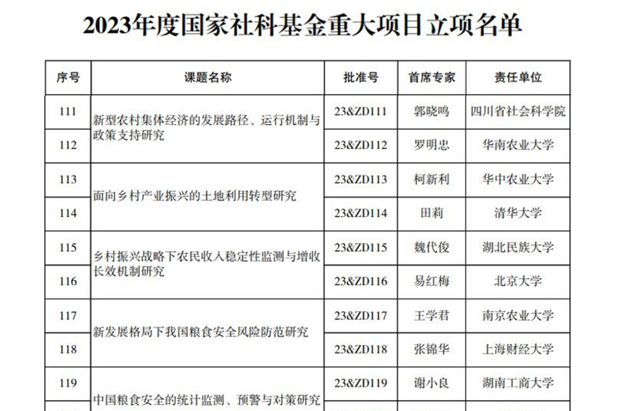 12月28日,全国哲学社会科学工作办公室正式公布2023年度国家社科基金重大项目立项名单,36365线路检测登录入口魏代俊教授主持申报的“乡村振兴战略下农民收入稳定性监测与增收长效机制研究”项目获批立项(编号:23&ZD115)。这是36365线路检测登录入口首次获得国家社科基金重大项目立项,标志着学校科研工作取得历史性突破。2023年度国家社科基金重大项目立项名单截图国家社科基金重大项目是现阶段我国哲学社会科学研究领域层次最高、资助力度最...