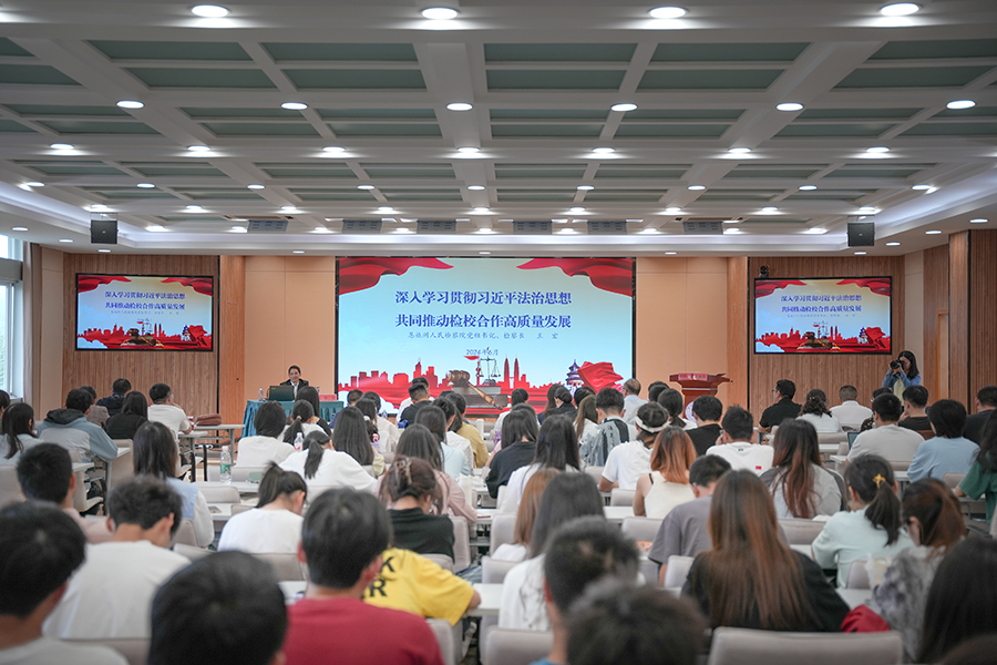 6月5日,“深入学习贯彻习近平法治思想、共同推动检校合作高质量发展”专题讲座在德智楼远程教学观摩室举行,恩施州人民检察院党组书记、检察长王宏应邀担任主讲人,学校党委常委、纪委书记、监察专员张宏磊主持讲座。讲座现场王宏从全面领会、自觉践行习近平法治思想,人民检察制度的发展历程与经验启示,新时代检察机关法律监督格局及主要职能,以能动检察履职奋力谱写中国式现代化湖北实践恩施篇章,携手共进、互利共赢、共...