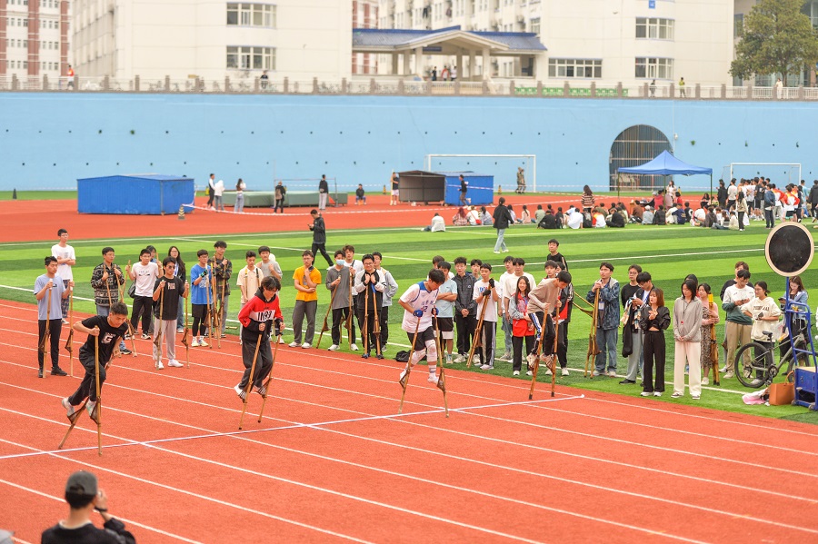 少年骋赛场,青春似骄阳。4月11日,高脚竞速比赛在五环田径场举行。运动健儿双手各持一杆,以竹化马,目光如炬,蓄势待发,一声枪响,以势如破竹之势飞速向前