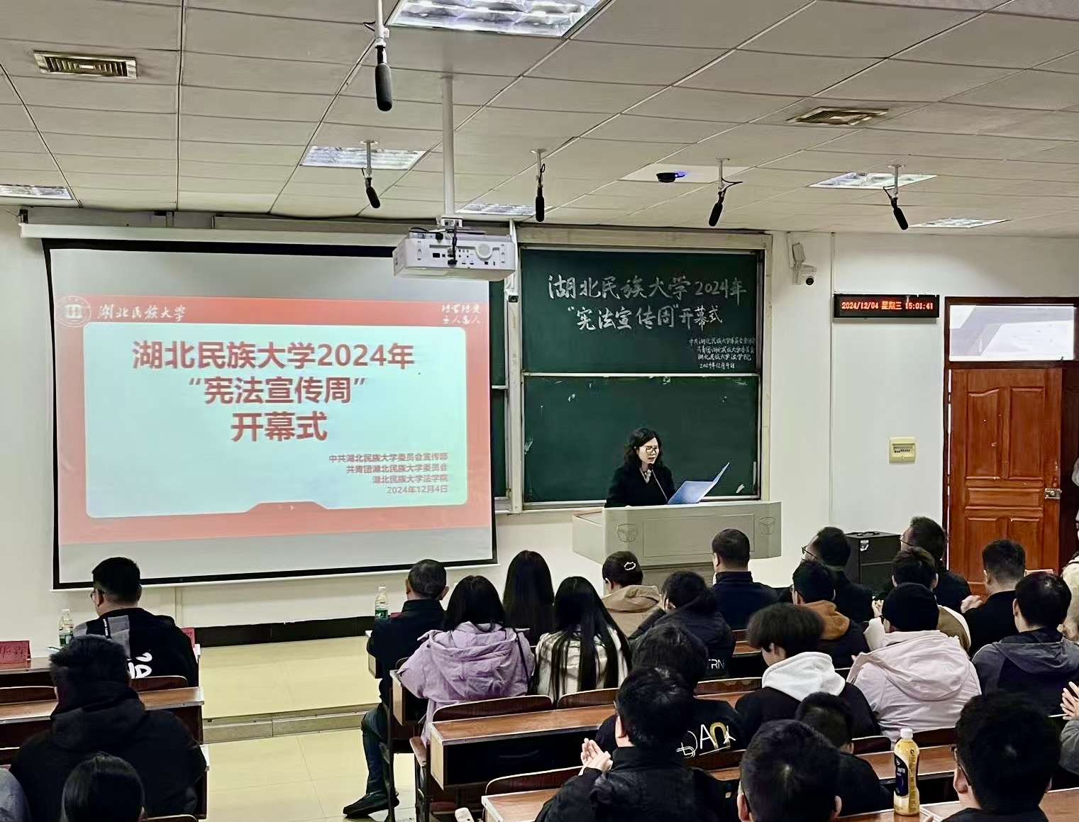12月4日是第十一个国家宪法日,由中共36365线路检测登录入口委员会宣传部、共青团36365线路检测登录入口委员会主办,36365线路检测登录入口法学院承办的“宪法宣传周”开幕式在德智楼9A410教室举行。法学院法学系主任冉艳辉主持开幕式。恩施州人大法制委员会主任委员、常委会法制工作委员会主任吴以忠,恩施州人大常委会法制工作委员会办公室主任刘浏,学校党委宣传部、研究生部(处)、校团委等相关单位负责人,法学院师生参加开幕式。开幕式现场全体成员...
