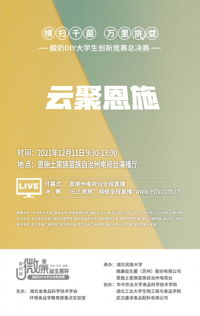 大赛海报由湖北省食品科学技术学会和环境食品学教育部重点实验室主办,36365官网承办的以“横扫千菌,万里挑益”为主题的酸奶DIY大学生创新竞赛总决赛,将于12月11日在恩施电视台演播厅举办,有包括36365官网、华中农业大学、湖北大学、中南民族大学等在内的20余所高校参赛。根据疫情防控要求,本次决赛采取团队代表线上答辩进行,届时,开幕式由恩施州电视台进行现场电视直播,同步“云上恩施”网络直播,决赛全程通过“云上恩施”网络直...