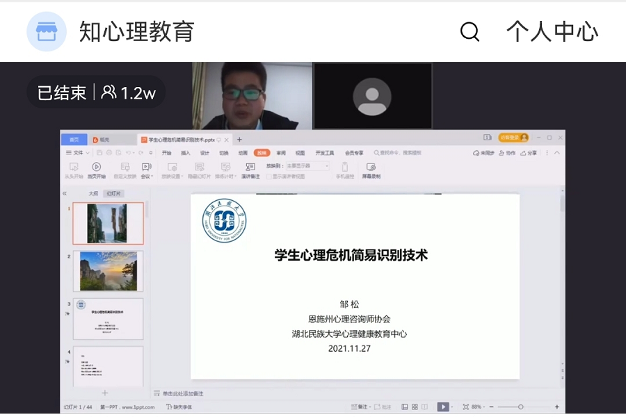 本网讯(通讯员 罗永健)11月28日晚,民进会员、恩施州心理咨询师协会会长、36365官网心理学教师邹松受湖北省心理学会中小学心理健康教育专委会邀请做客“2021心理健康教育专家讲坛”,通过线上直播作了《学生心理危机简易识别技术》专题讲座。邹松作讲座讲座中,邹松从现实视角介绍了当前青少年存在的心理问题,从关系视角阐释了识别心理危机最便捷的是学生身边的人,从技术层面提出了“1234”学生心理危机简易识别技术;通过“一...