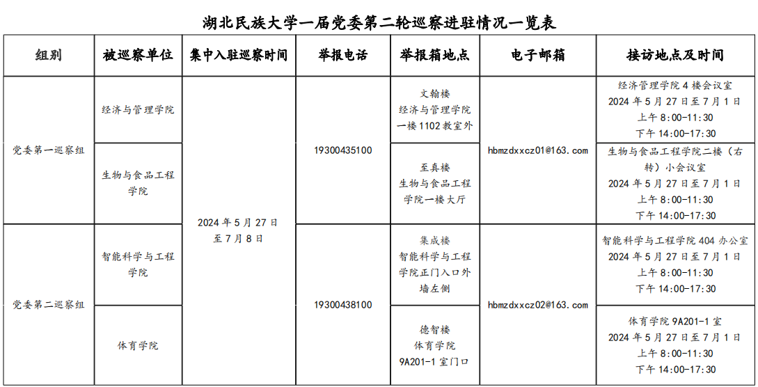 本轮巡察采取“一拖二”的方式,对经济与管理学院、智能科学与工程学院、生物与食品工程学院、体育学院等4个学院开展巡察。