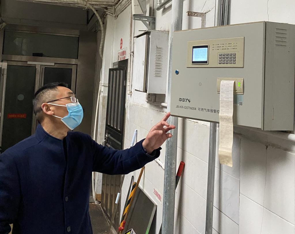 余来深入后厨查看食品储存和可燃气体报警设备情况