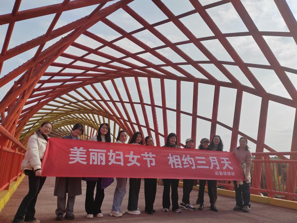 活动当天,后勤保障部女职工们欢聚一堂,来到旗峰坝体育公园,开启了一场别开生面的户外健步行活动。大家结伴同行,沿着蜿蜒的步道欣赏大自然的美景,沐浴春日暖阳,感受春天的生机与活力,在轻松愉悦的氛围中放松身心,既锻炼了身体,也增进了彼此的交流与友谊。活动过程中,女教职工们手持写有“美丽妇女节,相约三月天”字样的横幅,在体育公园的廊桥上合影留念,展现出新时代女性自信昂扬的精神风貌。