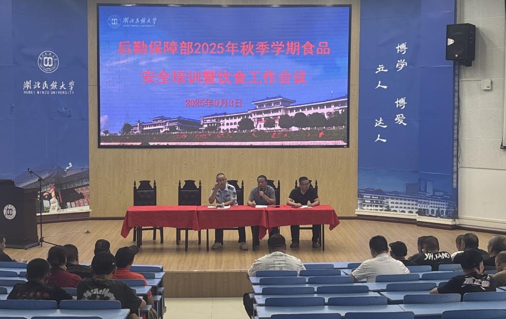 9月3日下午,后勤保障部2025年秋季学期安全培训暨饮食工作会议在图书馆多功能报告厅召开。恩施市市场监督管理局舞阳所副所长胡成学应邀出席本次会议并授课,饮食服务中心全体工作人员、各食堂经营单位负责人及全体从业人员等参加本次会议。会议由后勤保障部副主任高波涛主持。