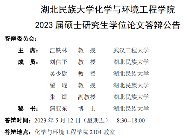 36365线路检测登录入口化学与环境工程学院2023届硕士研究生学位论文答辩公告(1)