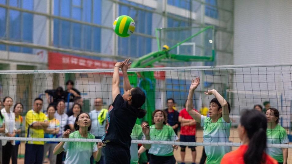 时近傍晚,体育馆里却是热情高涨的人群。裁判示意比赛开始后,面对对方的发球,男老师纵身一跃、将球反扣出去,动作间尽显运动力量和竞技精神;女老师巾帼不让须眉,她们对球托举、抛出,手臂一挥,空中便划过一道优美的弧线。