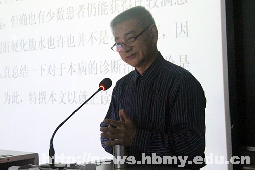 “肝硬化腹水在中医辨证里属于中医学‘水臌’、‘单腹胀’的范畴。”郑学刚教授随后围绕肝病的病因病机、治疗方法展开讲座。他指出,腹水是由人体正气虚弱的基础上气滞、血瘀和水停引起的,“感受外邪”“饮食问题”“精神原因”及“寄生虫”都是导致肝病的原因。该病临床多涉及肝脾肾三脏,应把疏肝、补脾、泄实结合起来,坚持攻补兼施原则。