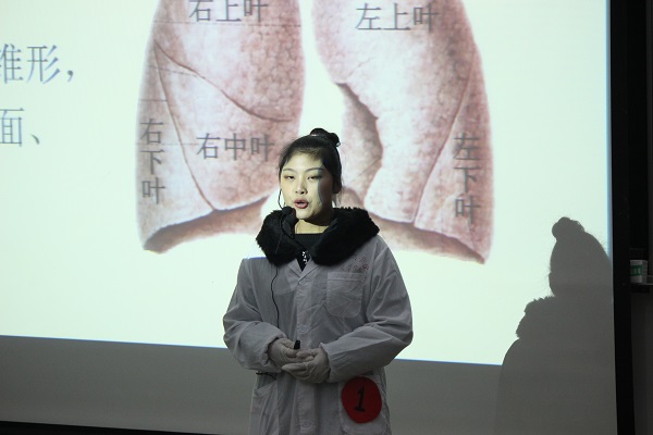 经过初赛、复赛和半决赛的激烈比拼,共有12名选手进入决赛。参赛选手选择人体内某一器官,结合PPT、教学所用的标本模型或实物标本针对器官的形态、位置、生理功能、组织结构、常见疾病和养生保养等方面进行描述。其中,1号选手邵文翠从形态、组织结构介绍“肺”的生理功能,通过标本形象地演示“肺”的结构;6号选手李雯根据“病从口入”的俗语向在场观众讲解“牙”的基本结构,并说明呵护牙齿需要加强钙、磷等元素的摄入,多吃膳食纤维食品;11号选手任莹芳由不吃早饭的危害引入胆囊在人体中的临床意义,介绍了胆囊的位置和胆囊组成部分的分布,内容涉及胆囊体、胆囊管、胆囊三角等。