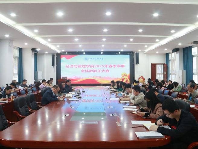 本网讯(李毅/文 肖雅轩/图)为进一步加强我院师德师风建设,深入贯彻学习习近平总书记关于教育的重要论述,大力弘扬教育家精神,进一步强化师德师风建设的重要性、必要性、紧迫性,根据学校《关于组织开展2025年师德师风学习教育的通知》(第一期)的相关要求,经济与管理学院于3月27日召开了全院教职工大会,集中组织开展了师德师风教育学习,院长张新平主持会议。