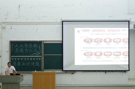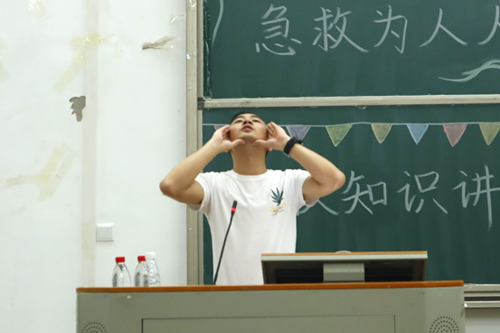谭靖围绕心肺复苏术、溺水现场急救、创伤现场急救原则、外伤与出血的现场急救四个方面展开讲解。在心肺复苏术讲解过程中,他以院内心脏骤停和院外心脏骤停生存链为切入点,介绍心肺复苏具体操作流程。同时,他通过PPT图片展示和现场教学相结合的方式,讲解胸外心脏按压位置,演示相关应急手势;在创伤现场急救原则讲解过程中,他以局部伤、穿刺伤、鼻出血三种类型创伤为例,阐述止血基本原则和具体步骤,防止学生盲目使用消毒水和各类止血药物。