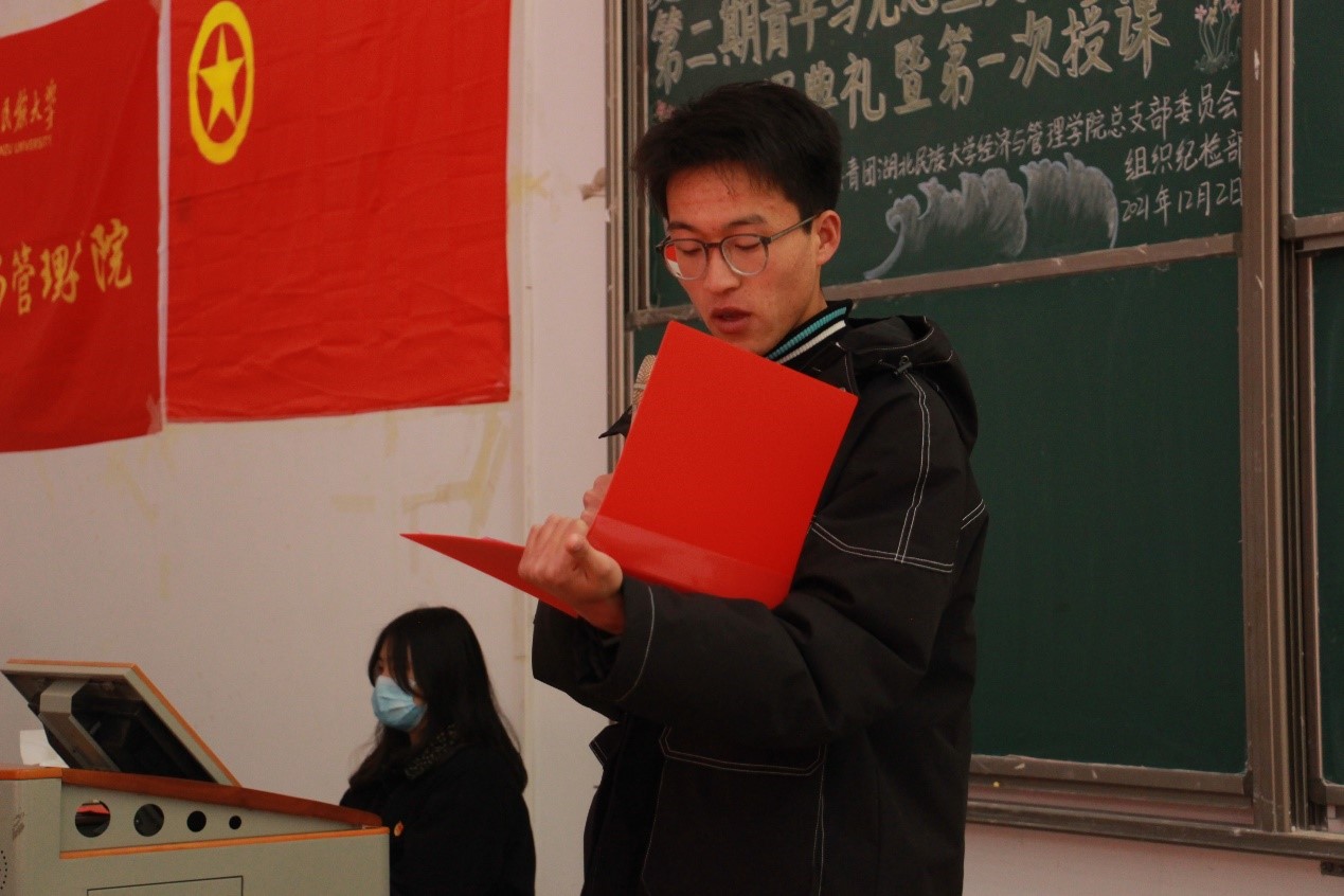 本网讯(见习记者 岑宇婷 梁晨 胡蝶/文 叶然 黄锐文/图)2021年12月2日,经济与管理学院第二期青年马克思主义培养工程开课典礼在修远楼5A207教室举行。经济与管理学院党委书记、副院长张新平,学生科科长曹骞,学生科老师覃杰、解丽娟、向绍阳应邀出席,团总支书记张典担任主持。