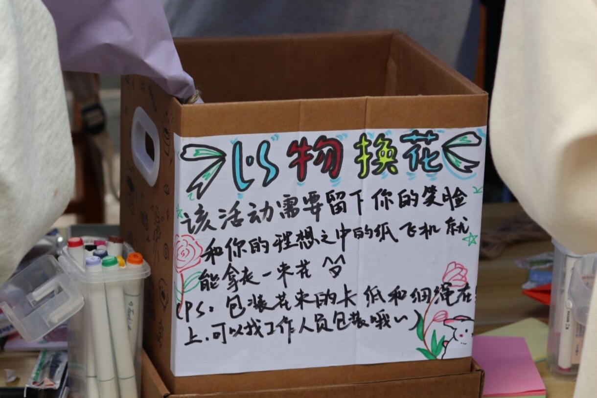 活动前期,通过线上和线下多种方式对活动进行介绍和宣传。本次活动,通过“以物易花”、“随心而动,百变小表情、“乘风而起,流浪纸飞机”的游戏方式让学生感受到青春的自由缤纷以及心灵的释放。