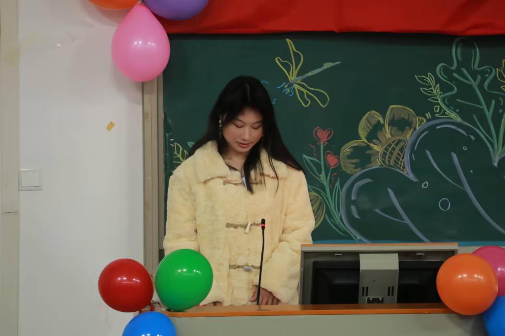 会员代表杨梦雨发言。她首先阐述大学生心连心互助社名字的含有,指出“心连心”是象征心与心紧密联系,代表着团结与奉献。并讲述自身在支教活动中与小朋友之间的温情互动。她表示,大学生心连心互助社是一个充满爱心的组织,希望大学生心连心互助社在未来能够做大做强,关爱他人、服务社会。
