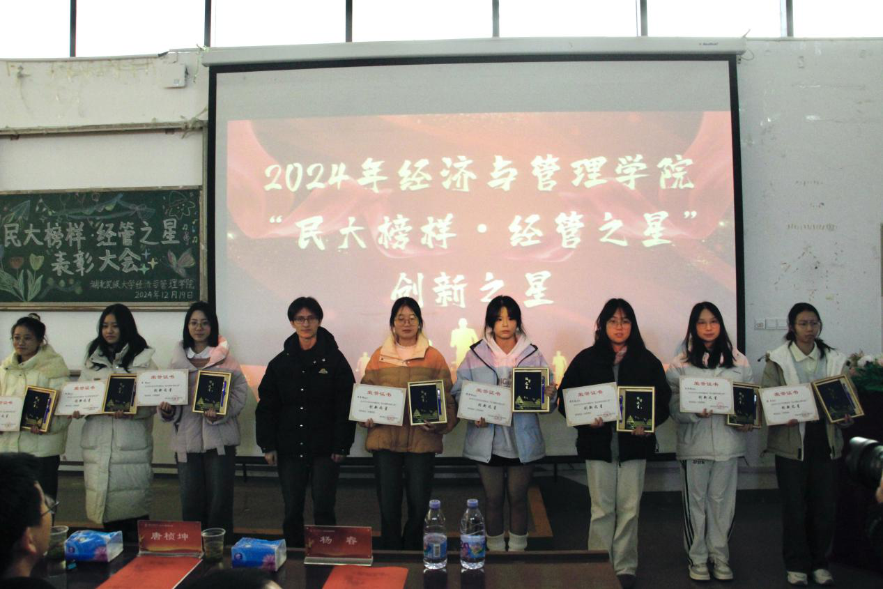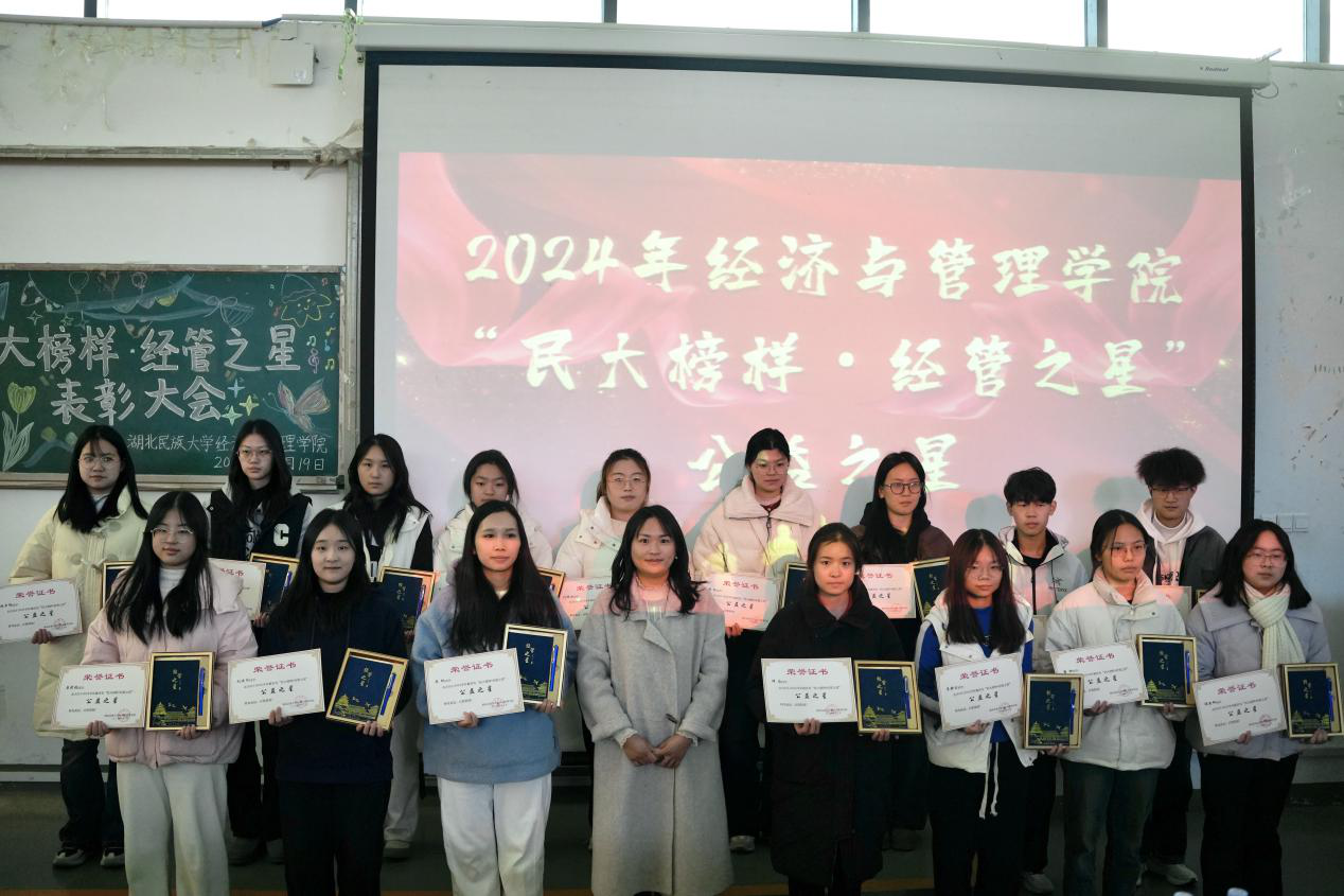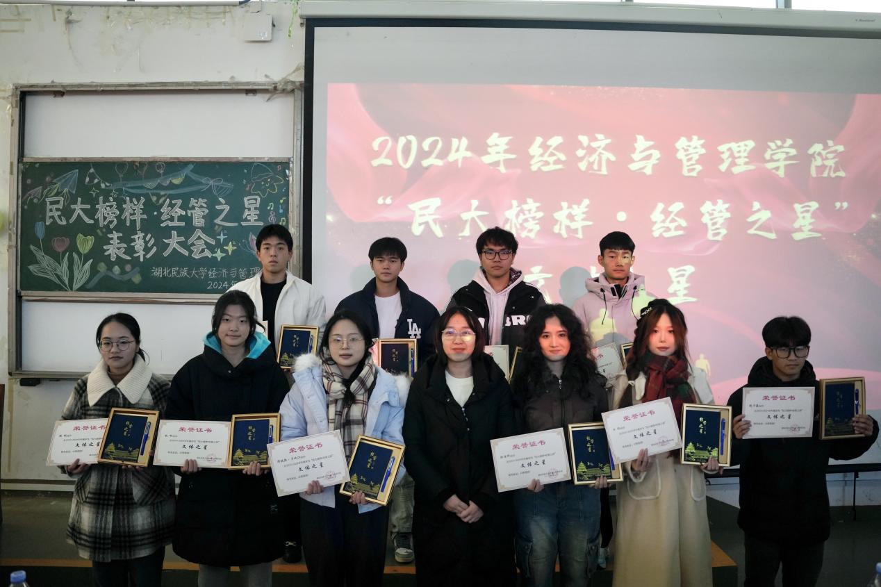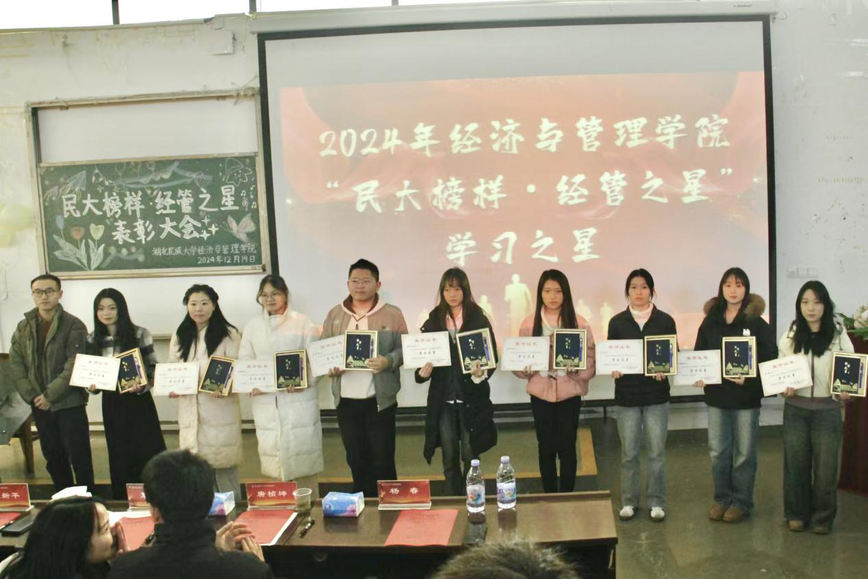 本网讯(见习记者 冯柯嘉 徐彤彤 郭佳/文 记者 郑诗彤 黄俊毅 见习记者 杨语嫣/图)为表彰先进,弘扬优良学风,激励广大学生积极进取。2024年12月19日,经济与管理学院联合“一站式”学生社区举办的2024年“民大榜样·经管之星”表彰大会在修远楼5B403报告厅隆重举行。经济与管理学院院长张新平,MPACC教育中心主任游宇,学生科科长覃杰,旅游管理系教师陈雪娇,学生科辅导员覃雨、杨睿、唐桢坤、亚克甫应邀出席本次大会。覃雨担任本次大会主持人。