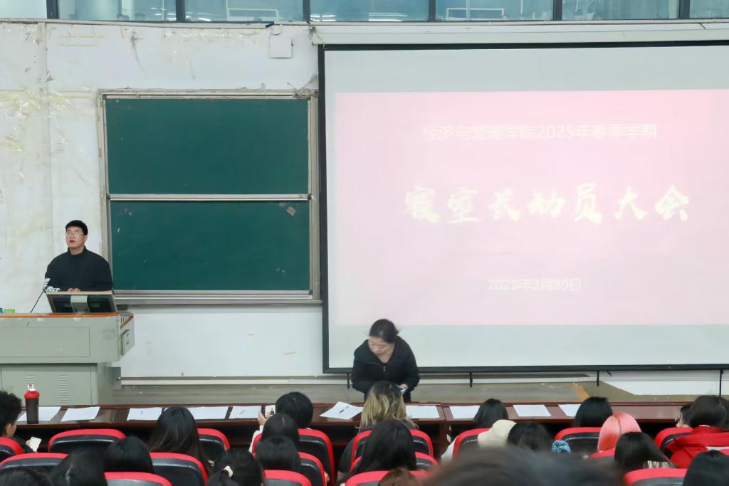 本网讯(见习记者 罗明/文 记者 毛莉/图)为进一步强化学生寝室安全管理,增强学生消防安全意识,2025 年3月30日,经济与管理学院联合“一站式”学生社区-春雨社区召开的2025年春季学期寝室消防安全隐患整治行动专题会在修远楼5B403多功能报告厅举行。学生科辅导员唐桢坤主持会议,经济与管理学院公寓管理委员会、全体寝室长参加本次会议。