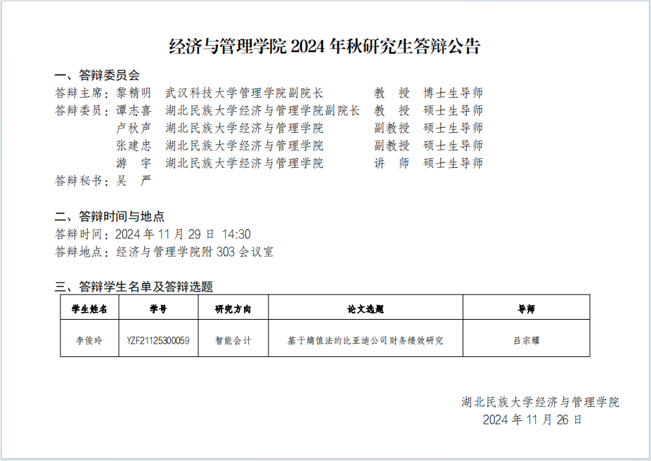 经济与管理学院2024年秋研究生答辩公告