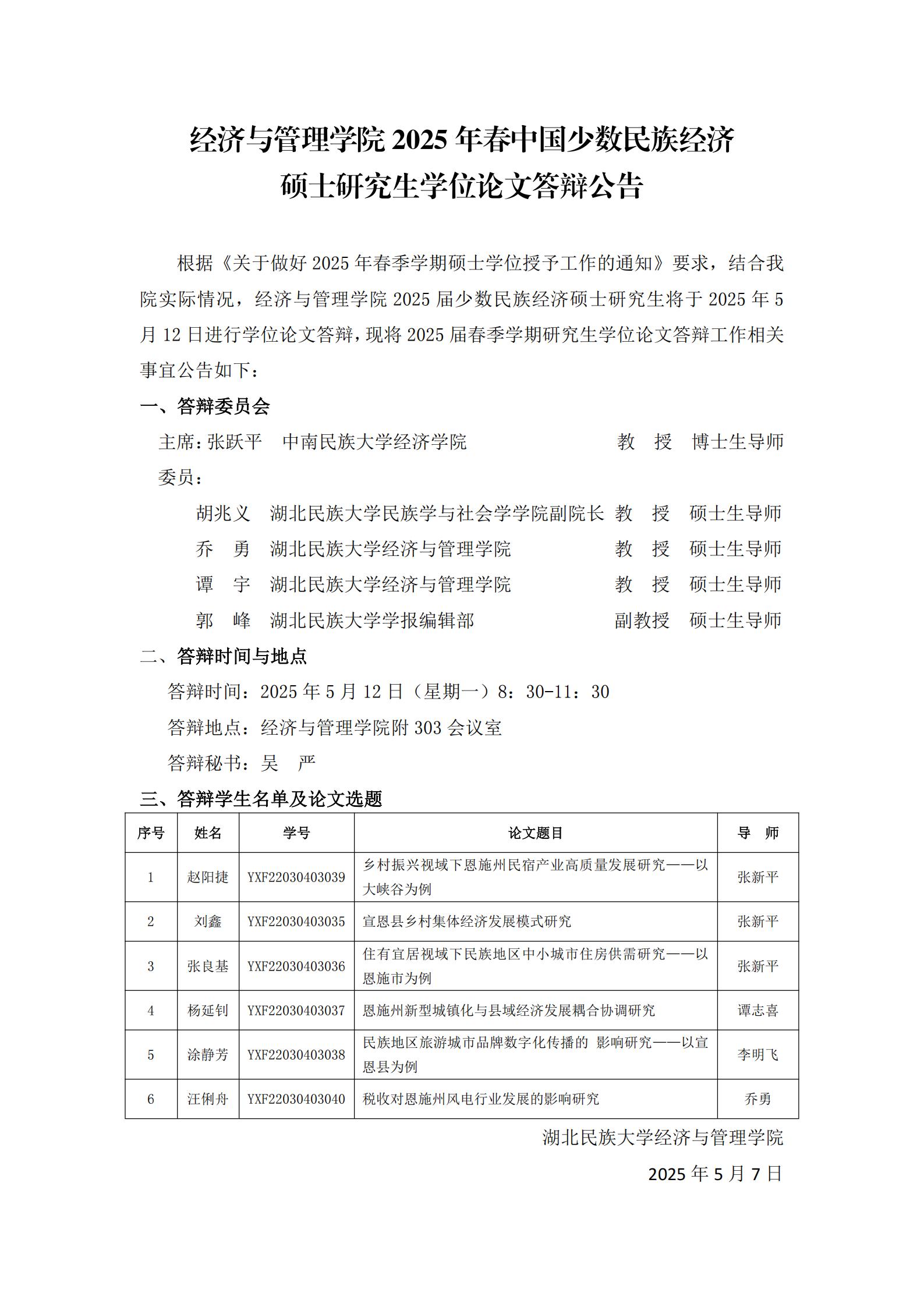 经济与管理学院2025年春中国少数民族经济硕士研究生学位论文答辩公告
