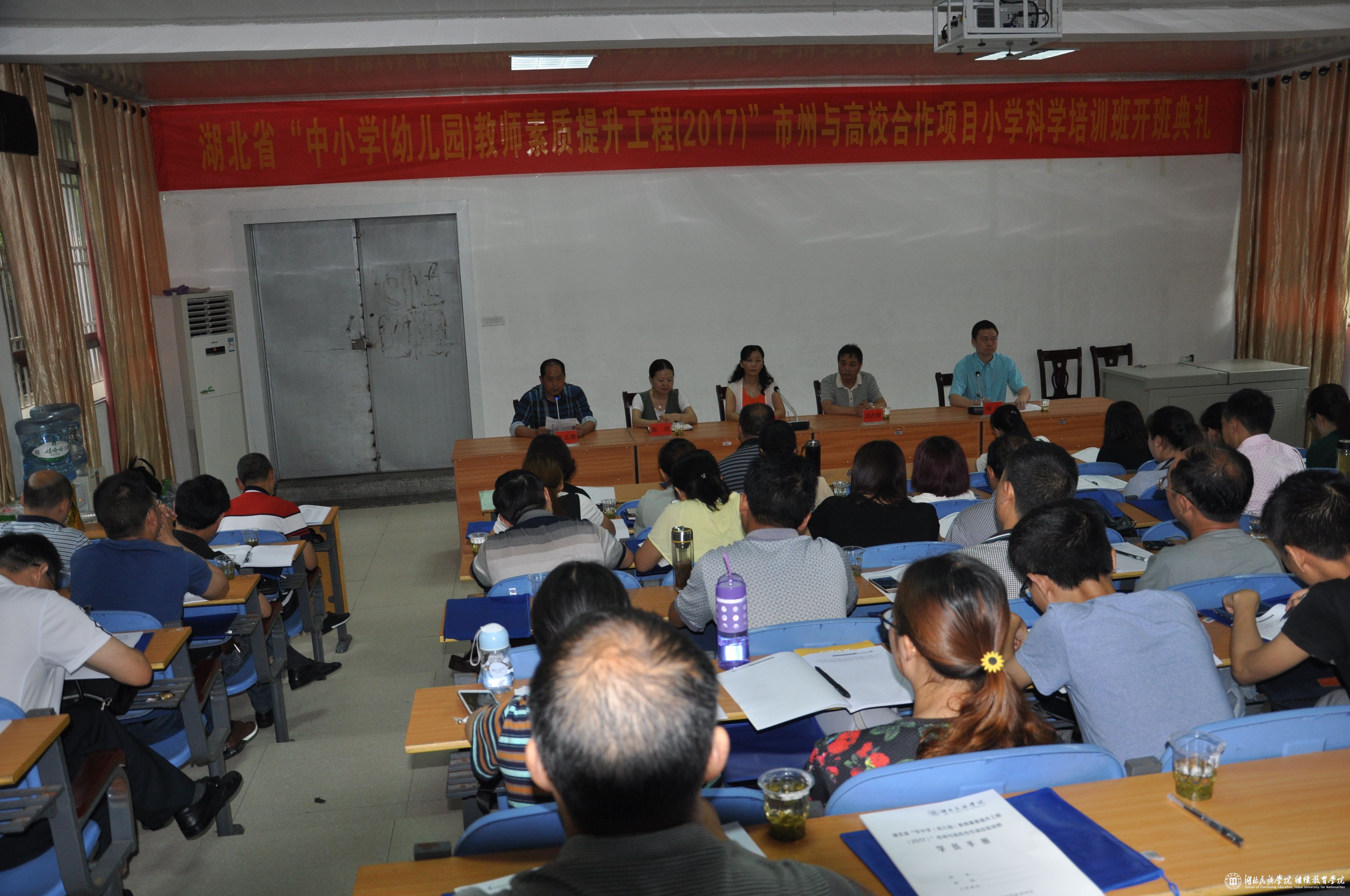 本网讯(通讯员 杨斌 魏兴奎)湖北省“中小学(幼儿园)教师素质提升工程(2017)”市州与高校合作项目小学科学培训班于7月9日上午在我院1109培训厅正式开班,恩施州教科院院长汤吉舜、教育学院党委书记刘际华、非学历教育管理科科长周鸿、培训班班主任以及来自全州8个县市的100名学员参加了开班典礼。典礼由非学历教育管理科副科长杨斌主持。