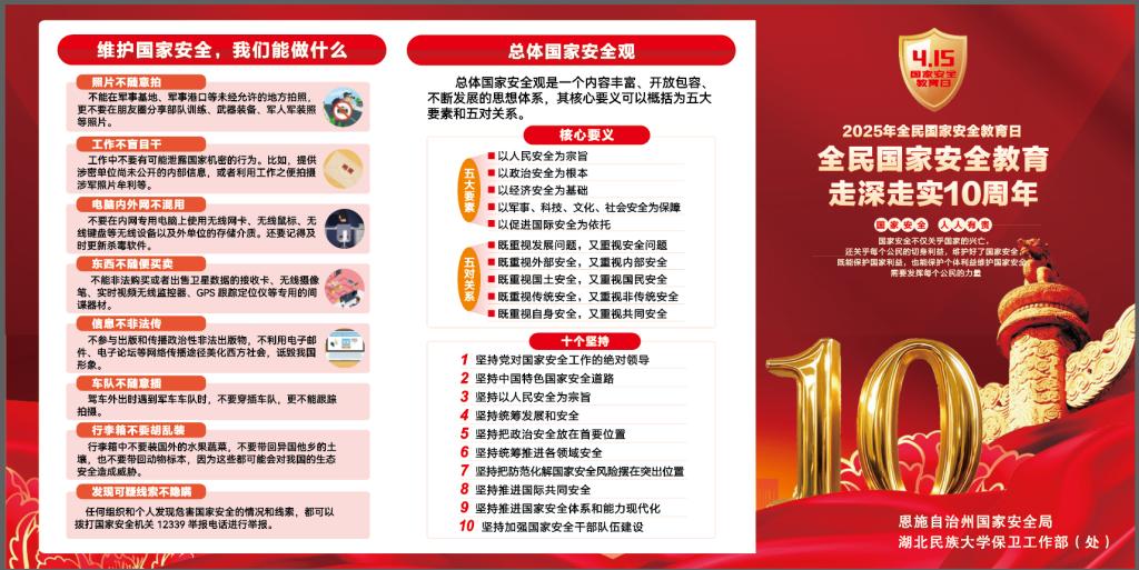 以案释法强意识,警校联动筑防线。恩施市公安局大队长陈泽权、舞阳坝派出所副所长王烁结合高校实际,通过典型案例剖析,深入解读《国家安全法》《反间谍法》等法律法规,系统阐述政治安全、网络安全、反恐防暴等领域的风险隐患,并针对校园生活中可能涉及的保密管理、网络言论规范等问题提出具体防范建议。生动鲜活的宣讲引发师生热烈讨论,现场互动频频。宣讲结束后,现场发放国家安全宣传册40余份。