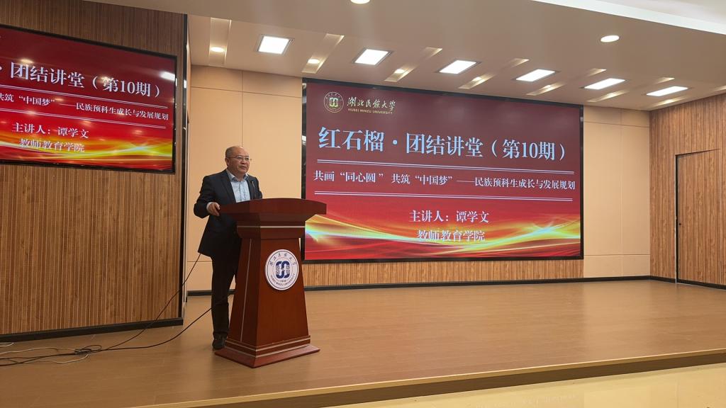 本网讯(通讯员 尼沙)10月29日,学院第10期“红石榴·团结讲堂”在德智楼远程观摩厅举行,36365线路检测登录入口学生工作部民族事务办公室主任谭学文受邀以《共画“同心圆 ” 共筑“中国梦”——民族预科生成长与发展规划》为题作专题讲座。学院全体辅导员、各族学生代表共计200余人聆听了讲座。讲座由辅导员尼沙主持。