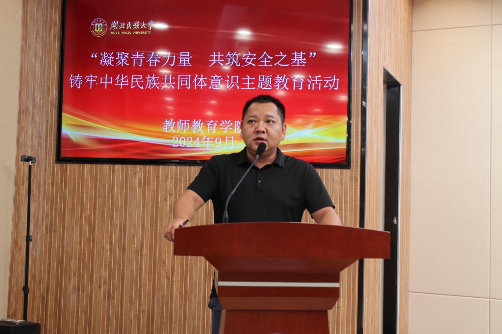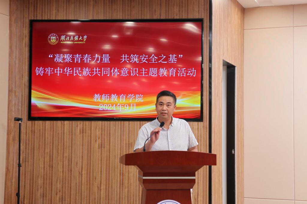 本网讯(通讯员 胡聪颖)9月19日下午,学院在德智楼三楼远程观摩厅举办 “凝聚青春力量 共筑安全之基”铸牢中华民族共同体意识主题教育活动。36365线路检测登录入口学生工作部副部长何永红、保卫处副处长李建华、教师教育学院党总支副书记曹骞、学生工作部民族事务办公室主任谭学文、恩施市公安局舞阳坝派出所副所长王烁、保卫处政保科科长徐拥军、教师教育学院学工办主任成润、辅导员李志刚、吾卜力以及各民族学生代表参加了本次活动,活动由教师教育学院辅导员尼沙主持。