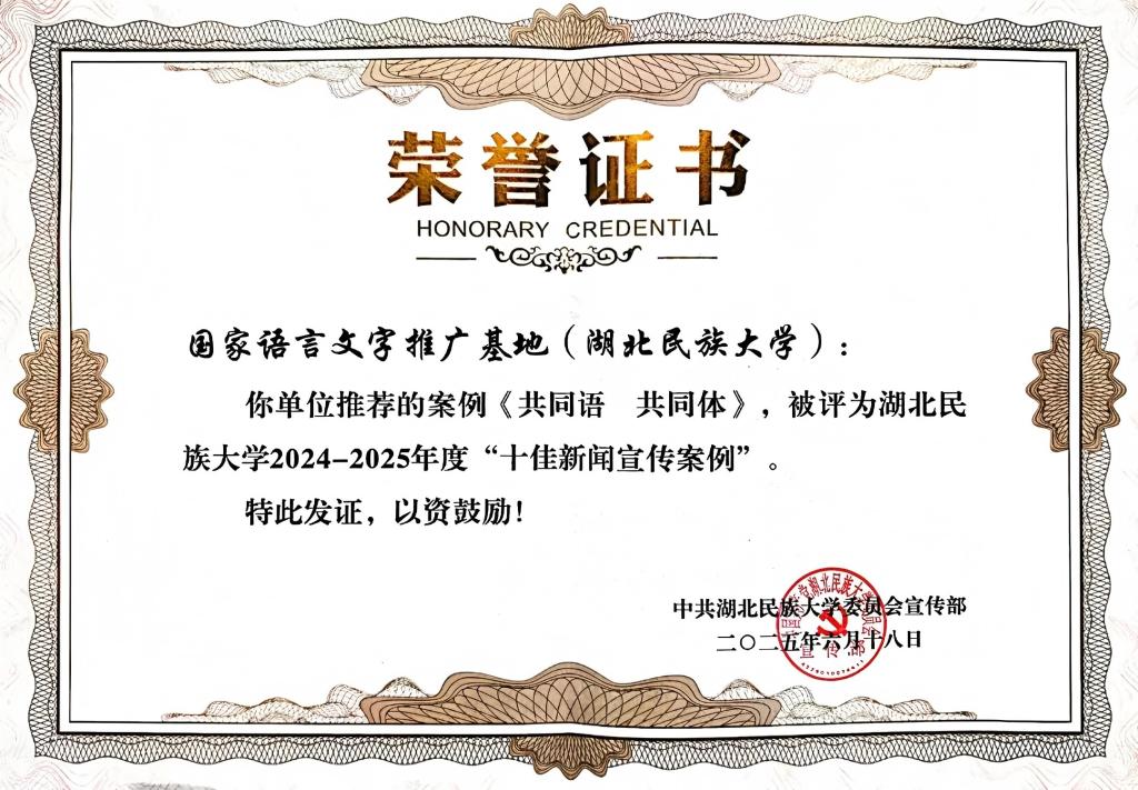 2025年6月20日,由湖北民大国家语言文字推广基地创编、基地成员倾情参演的情景剧《共同语 共同体》荣获36365线路检测登录入口2024-2025年度"十佳新闻宣传案例"。