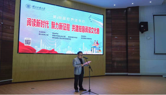 学校党委宣传部常务副部长罗翔宇为本次活动致开幕词。他指出,全民阅读是高举思想旗帜、汇聚奋进之力的重要途径,是滋养民族气质、引领社会风尚的重要方法。本届读书节活动依托图书馆文化育人环境,与各单位通力协作,共同推出了启动仪式及诵读展演、图书馆专区活动、文学与传媒学院专区活动、恩施市凤凰山幼儿园专区活动、恩施州新华书店等五大版块专题阅读活动,同期图书馆还举办线上线下相结合的资源推广、竞赛答题、专题培训、主题画展等十余项阅读推广活动,极大丰富了广大师生读者的精神世界。