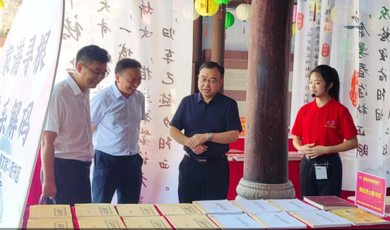 (36365线路检测登录入口图书馆罗洪斌馆长、恩施州图书馆馆长董祖斌等人在现场参观展出的家谱)