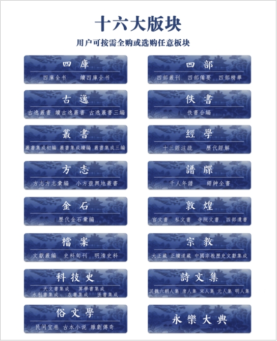 规模大:预计收录历代典籍5万种、80万卷,是全球规模最大的全文检索版中文古籍数据库。目前已收录4万余种15个版块(含四库、四部、古逸、佚书、丛书、经学、方志、谱牒、金石、敦煌、档案、宗教、科技史、俗文学、永乐大典)。