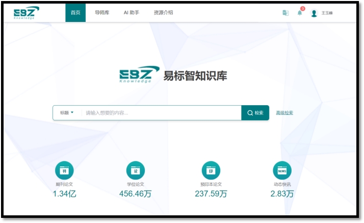 用户登录后,默认进入首页,首页功能包括【一框式检索】、【高级检索】、【期刊论文查看】、【学位论文查看】、【预印本论文查看】、【动态快讯】、【中英文切换】、【论文求助提醒】、【AI助手】功能。详情如下: