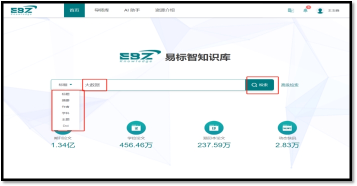 用户可以选择不同检索类型(标题、摘要、作者、学科、主题、DOI),输入关键字点击【检索】按钮,查看对应的文献,文献内容包括(期刊论文、学位论文、预印本论文、动态快讯)。详情如下: