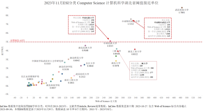 表6对湖北省內机构Computer Science计算机科学学科阈值接近单位进行分析,武汉科技大学和中南财经政法大学已经入围ESI学科前1%,中南民族大学尽管潜力值大于1,但本期尚未入围。