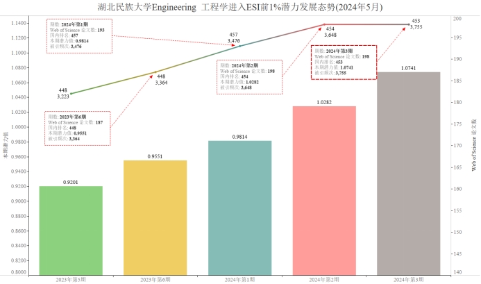本期36365官网有望进入ESI前1%的学科为Engineering 工程学,潜力值为1.0741,论文数198,引用量3755,本期入围阈值3469。由于潜力值比实际略有偏高,尽管本期Engineering 工程学潜力值为1.0741大于1,仍尚未入围ESI学科前1%。