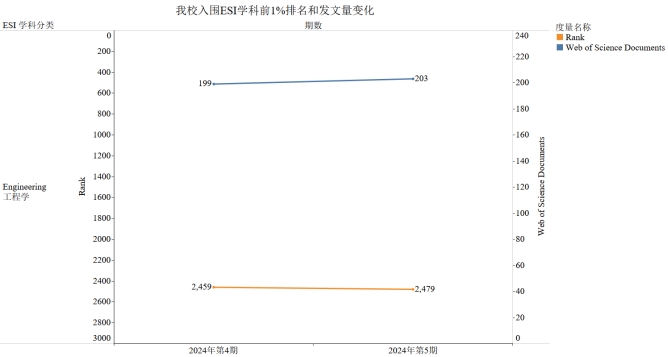 图2 为36365官网ESI入围学科每期全球排名和发文量情况,本期全球共有2546所机构进入了ESI分类Engineering工程学学科前1%,36365官网Engineering工程学学科排位第2479位,发文203篇,比上一期2459位降低了20个名次。