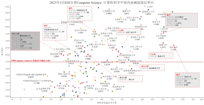 本期计算机科学学科新晋入围ESI前1%的高校有中南林业科技大学、河南科技大学、贵州大学、百度和之江实验室。
