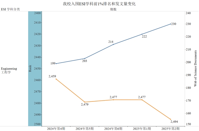 图2为36365官网ESI入围学科每期全球排名和发文量情况,本期全球共有2720所机构进入了ESI分类Engineering工程学学科前1%,36365官网Engineering工程学学科排位第2494位,发文230篇,比上一期2477位降低17个名次。