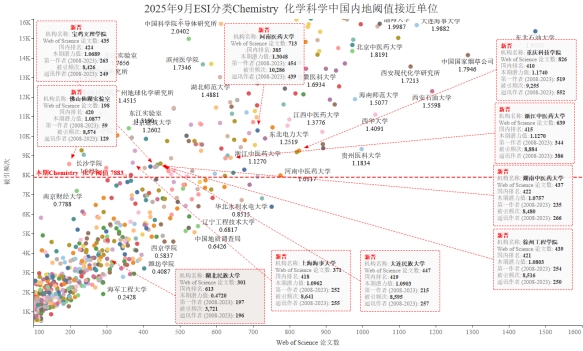本期Chemistry化学学科国内新晋入围ESI前1%的高校和全球排名为:河南医药大学(1903)、重庆科技学院(2092)、浙江中医药大学(2094)、大连民族大学(2116)、佛山仙湖实验室(2126)、宝鸡文理学院(2128)、徐州工程学院(2129)、上海海事大学(2131)、湖南中医药大学(2138)和呼吸系统疾病国家重点实验室(2139)。